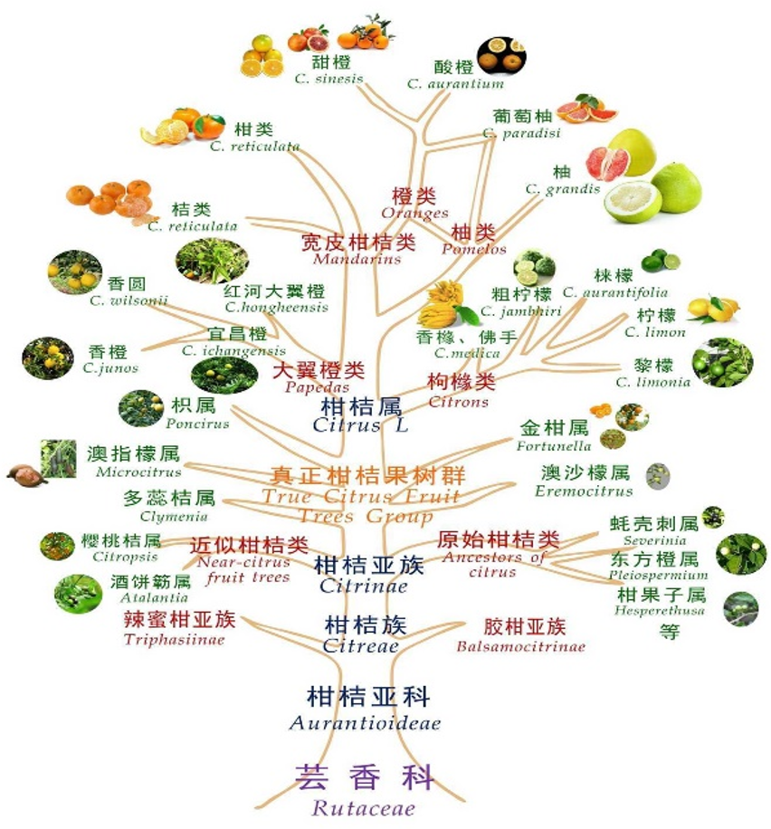 柑和桔二者常統(tǒng)稱為“柑桔”,屬于蕓香科(Rutaceae)柑桔屬木本植物,共有17個種,分成6個種群:大翼橙類、宜昌橙類、枸櫞檸檬類、柚類、橙類和寬皮桔類。柑桔類水果主要包括:桔、柑、柚子、葡萄柚、枸櫞、甜橙、酸橙、金柑、檸檬等,其中最具經(jīng)濟價值和食用價值的依次是甜橙、桔、柑、柚子、檸檬等。