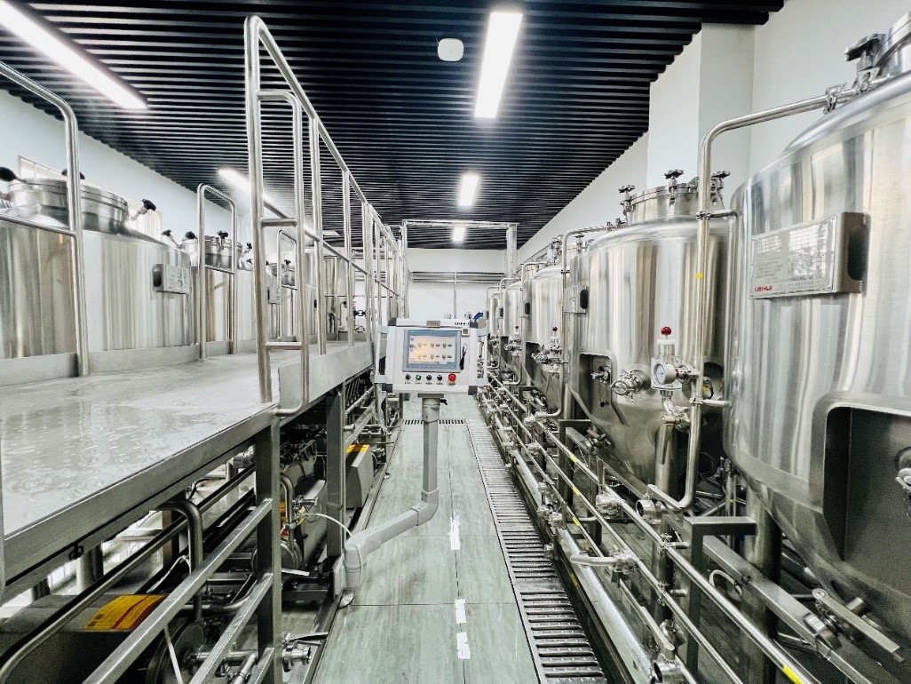 初期,研發(fā)團(tuán)隊(duì)堅(jiān)持高強(qiáng)度學(xué)習(xí),并先后赴十余家啤酒設(shè)備廠、研究機(jī)構(gòu)實(shí)地考察學(xué)習(xí),高效率高質(zhì)量建成了中試車間,打造了一條可進(jìn)行連續(xù)投料、鍋槽互通的300L自動(dòng)化糖化釀造生產(chǎn)線,可實(shí)現(xiàn)煮出糖化、降溫回旋等特殊工序,同時(shí)配備易拉罐自動(dòng)灌裝線、keg桶灌裝線等專業(yè)裝置,為配方開(kāi)發(fā)及工藝優(yōu)化打下了堅(jiān)實(shí)的基礎(chǔ)。