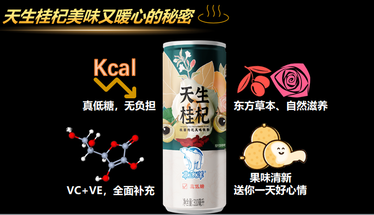 天生桂杞是一款集滋補(bǔ)氣血、養(yǎng)生駐顏、補(bǔ)充能量、增強(qiáng)免疫力為一體的暖心飲料。產(chǎn)品從消費(fèi)者需求出發(fā),原料十分考究。選用烏龍嶺鮮桂圓汁、中寧枸杞、山東平陰玫瑰和古法紅糖等優(yōu)質(zhì)天然原料,桂圓、枸杞、玫瑰這樣的神仙搭配除了賦予產(chǎn)品果香清新、花香淡雅的口感外,還具有滋補(bǔ)強(qiáng)體、養(yǎng)心安神、益脾開胃、和血養(yǎng)血、調(diào)經(jīng)等功效。天生桂杞中還添加了能清除自由基、祛斑美白、增強(qiáng)免疫力的維生素E和維生素C。有了這些原料的加持,可以說(shuō)天生桂杞是一款藥食同源、東西結(jié)合、多方位滋養(yǎng)的健康暖飲,無(wú)論是可愛(ài)的小姐姐還是中年的大叔們都能暢快喝,無(wú)負(fù)擔(dān),不長(zhǎng)胖。