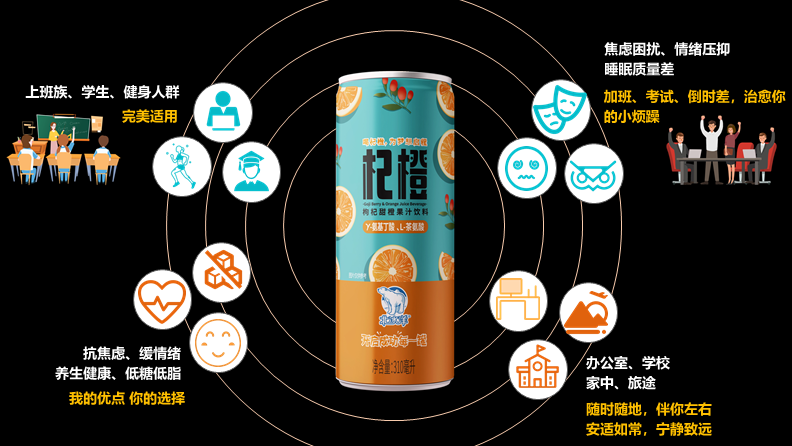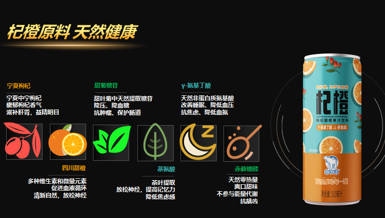 杞橙是一款具有枸杞甜橙風(fēng)味的無(wú)糖抗焦慮飲料,選用寧夏“中寧枸杞”壓榨的鮮枸杞汁和“西鳳臍橙”濃縮橙汁,完整的保留了果汁中的主要活性成分枸杞多糖、β胡蘿卜素、甜菜堿等,果香馥郁。杞橙中添加了具有放松神經(jīng)及抗焦慮作用的天然安神解壓成分γ-氨基丁酸(GABA)和提取自茶葉的可提高學(xué)習(xí)和記憶能力的功能性成分L-茶氨酸。杞橙不添加蔗糖,選用植物甜味劑赤蘚糖醇和甜菊糖苷,符合現(xiàn)代人對(duì)低卡路里、無(wú)糖、無(wú)脂肪的健康生活方式。杞橙的抗焦慮的功效和0糖低脂的配方優(yōu)點(diǎn),完美適用于上班族、學(xué)生、健身人群,在加班、考試、倒時(shí)差的時(shí)候,舒緩你的情緒,治愈你的小煩躁;在辦公室、學(xué)校、家中、旅途中無(wú)負(fù)擔(dān)暢飲,讓你安適如常,寧?kù)o致遠(yuǎn)。